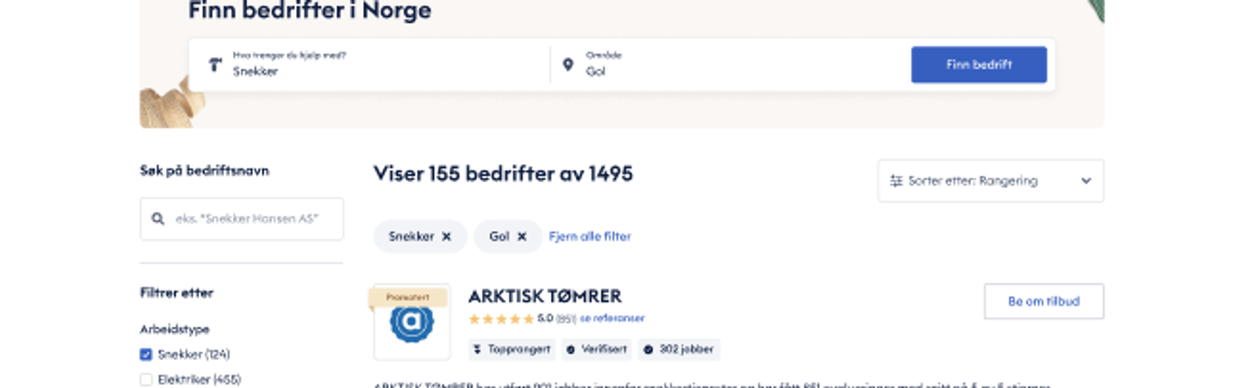 Hvis det flere enn tre bedrifter som har samme utgangspunkt for å bli vist i søk, vil bedriftene vises tilfeldig i søkeresultatene.