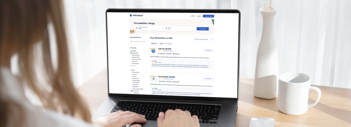 Dette gjør vi ved å kombinere informasjonen som du har delt om bedriften din, for eksempel fagfelt og hvor du utfører oppdrag, med vår database av forbrukere og ny teknologi. Resultatet er at din bedrift er i søkelyset hver gang noen i ditt område leter etter en bedrift med din kompetanse på Mittanbud.